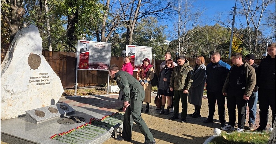 Перед началом экскурсии сотрудники следственных подразделений в торжественной обстановке возложили к мемориалу цветы и почтили память погибших при исполнении служебного долга военных контрразведчиков Дальнего Востока и Забайкалья.