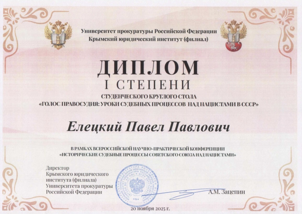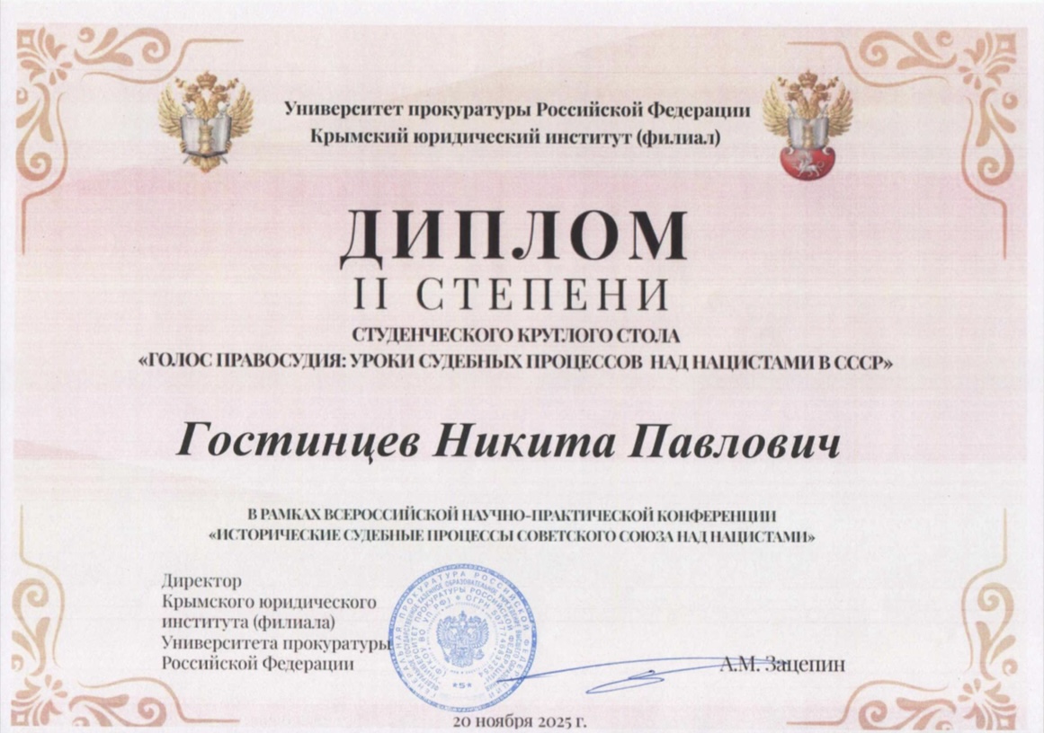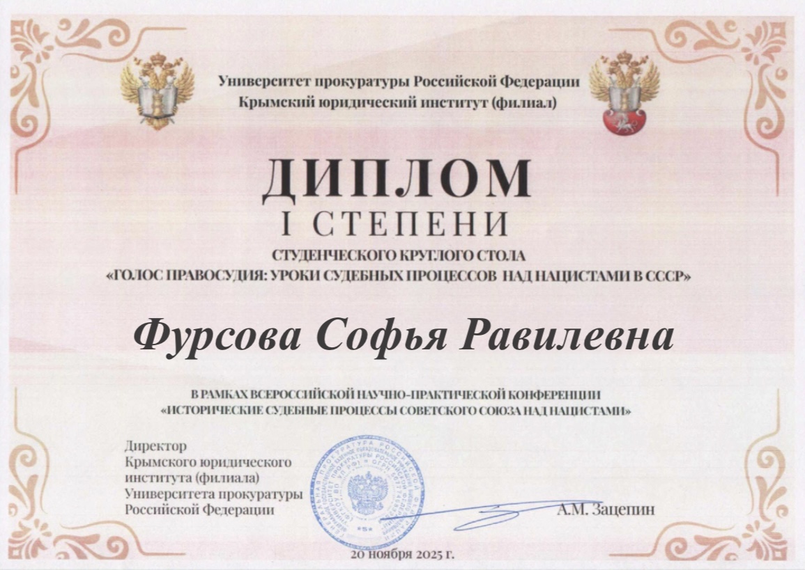 В Крымском юридическом институте (филиале) Университета прокуратуры Российской Федерации состоялся студенческий круглый стол «Голос правосудия: уроки судебных процессов над нацистами в СССР» в рамках Всероссийской научно-практической конференции «Исторические судебные процессы Советского Союза над нацистами».