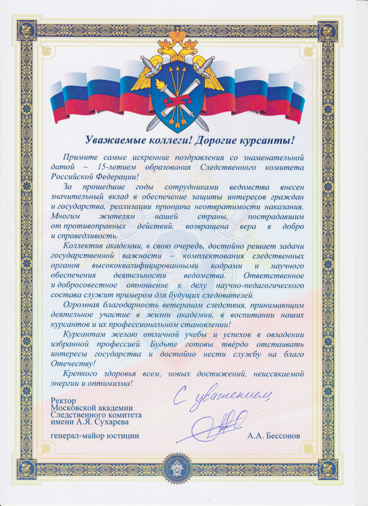 Поздравление ректора Московской академии Следственного комитета имени А.Я. Сухарева с Днем образования Следственного комитета
