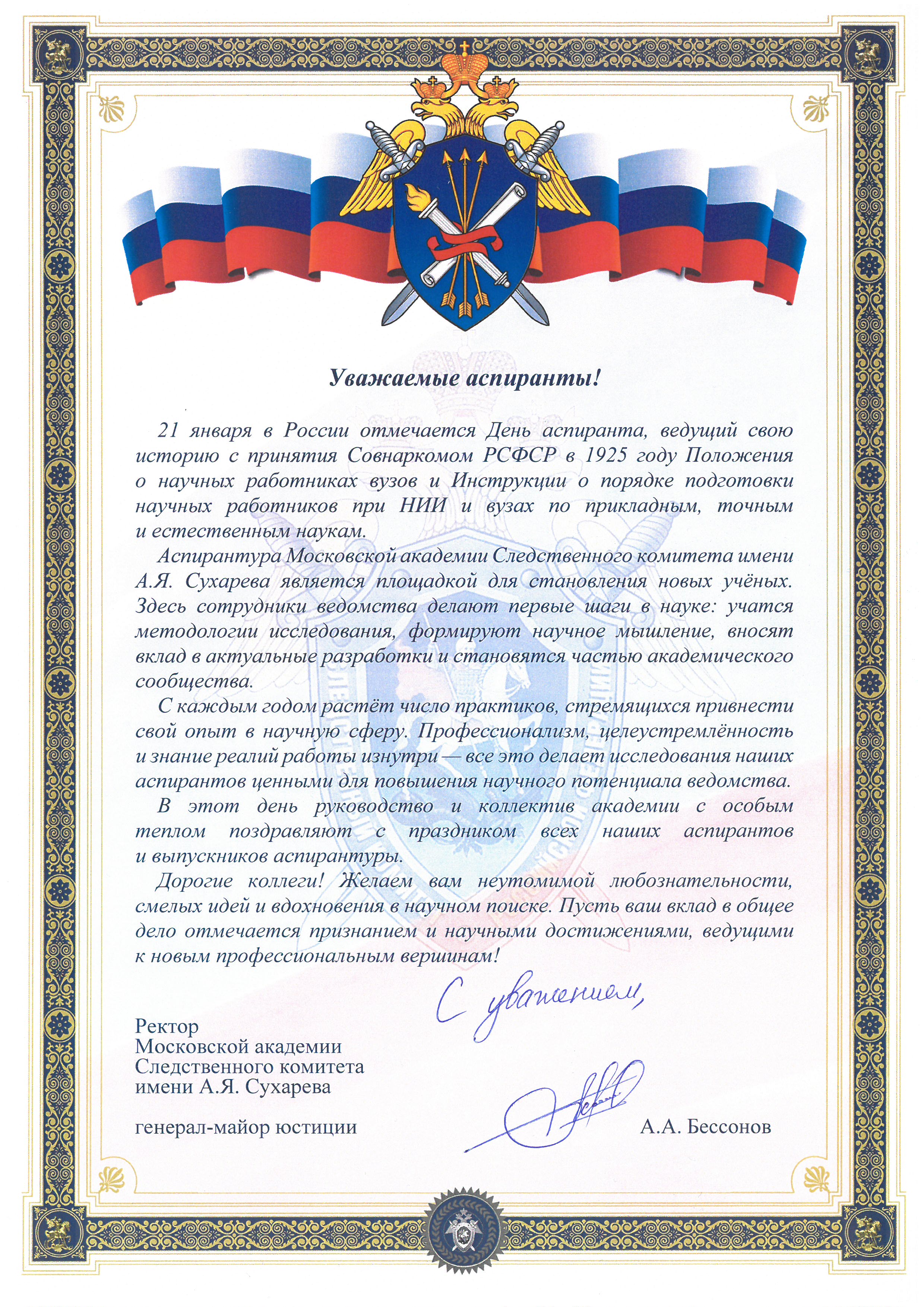 Поздравление ректора А.А. Бессонова с Днем аспиранта