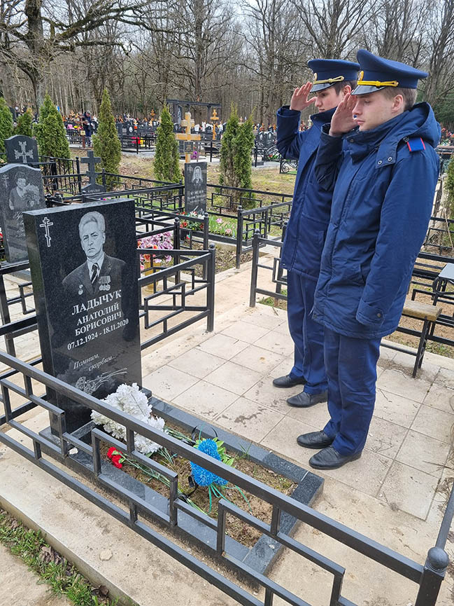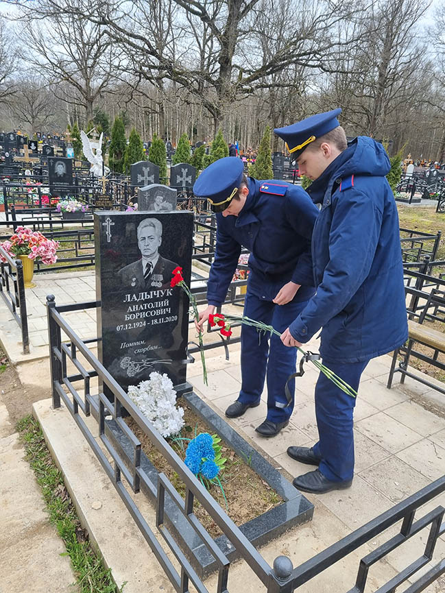 В преддверии 81-годовщины Великой победы курсанты 4 курса факультета подготовки следователей Кирилл Осокин, Данила Шамаев и заместитель руководителя отдела воспитательной работы Дмитрий Петрович Цуркан побывали на Киовском кладбище г. Лобня и благоустроили захоронение ветерана Великой Отечественной войны, ветерана следствия Анатолия Борисовича Ладычука (1924– 2020).